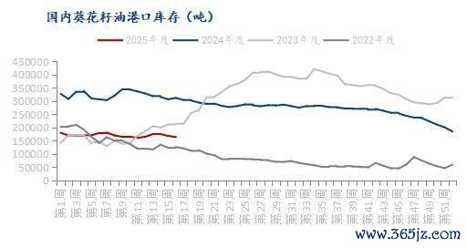 通过近四年的库存趋势图可以看出,现阶段国内葵花籽油库存处于相低位的位置。据Mysteel调研统计,截至2025年第16周,国内葵花籽油库存约16.4万吨,环比跌幅2.38%,同比跌幅47.35%。受供应影响,厂家挺价心态较浓,价格处于相对高位。目前实际终端需求较为疲软,就目前来看,后期国内月均进口量预计5万吨左右,全年进口缩减明显,预计国内以消化现有库存为主。