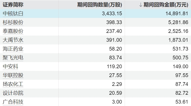 11家上市公司股票获回购,中核钛白回购金额最高