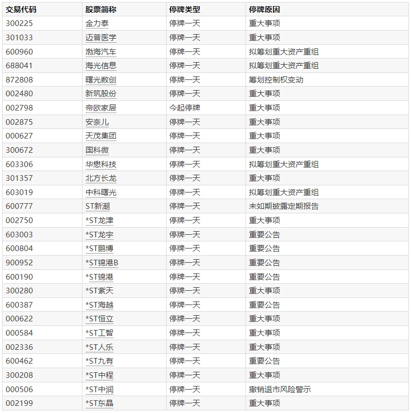A股停牌提示:28股今日停牌